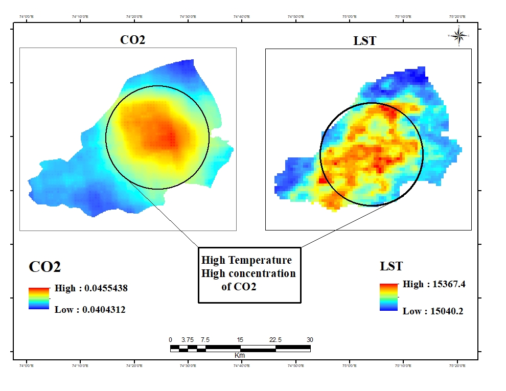 LST_Source: MODIS/061/MOD11A1 CO2(Air Pollutant) Source: COPERNICUS/S5P/OFFL/L3_CO Tools: GEE & ARCMap Description: Correlation of air pollutants and LST of Lahore. This map highlights the direct relationship between CO2 and LST. Areas where CO2 is present in higher amounts have higher temperatures